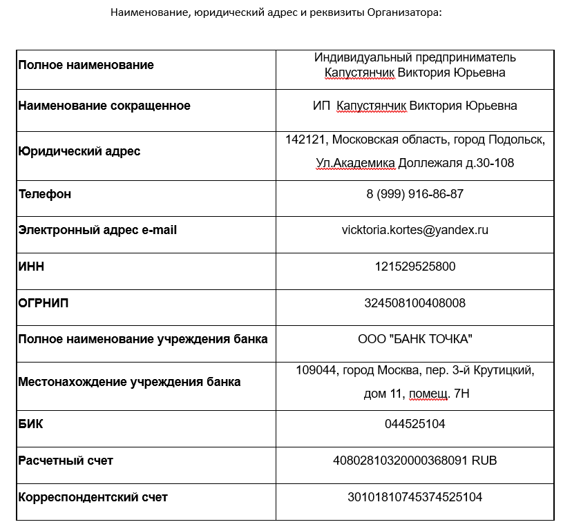 Наименование, юридический адрес и реквизиты Организатора:
